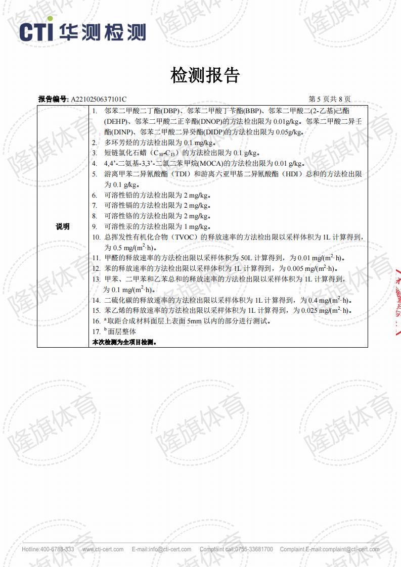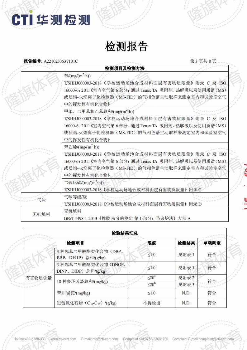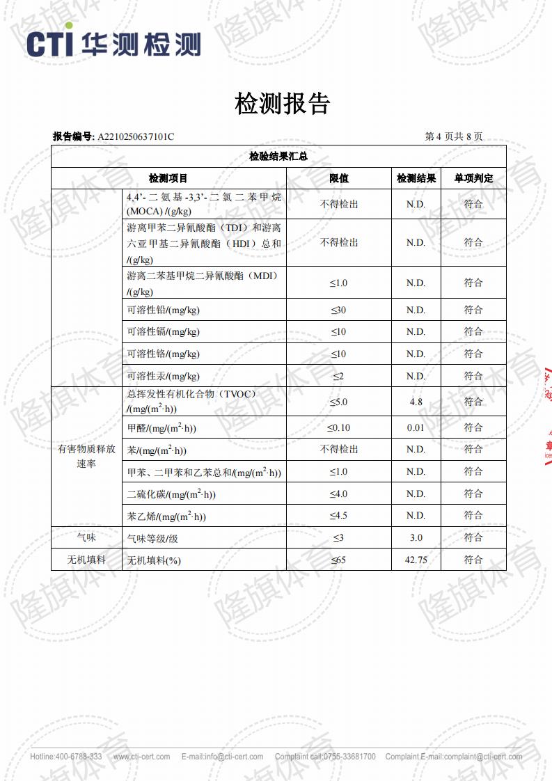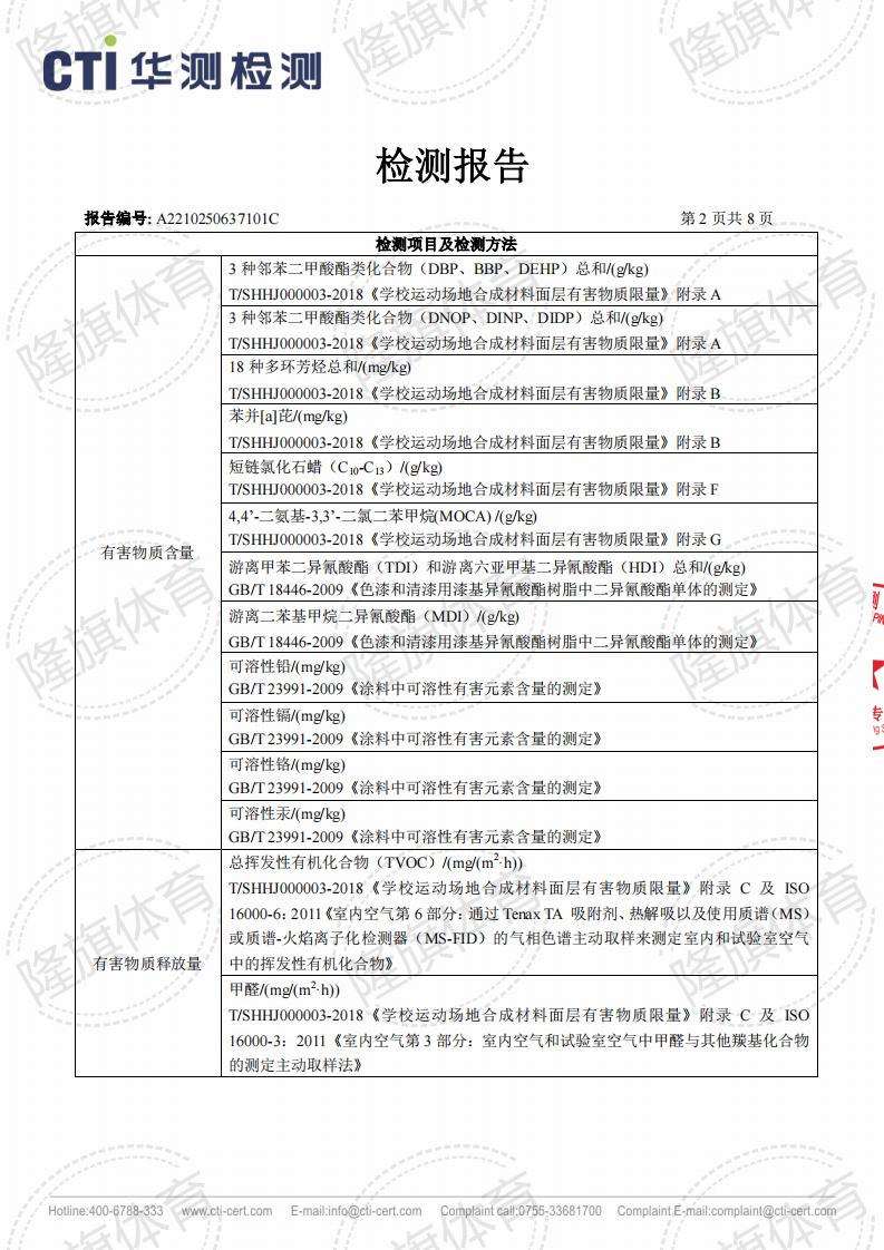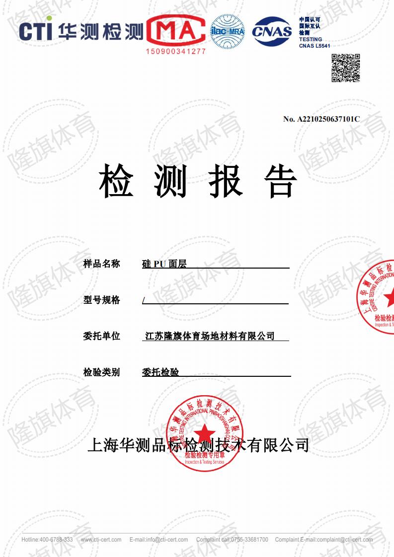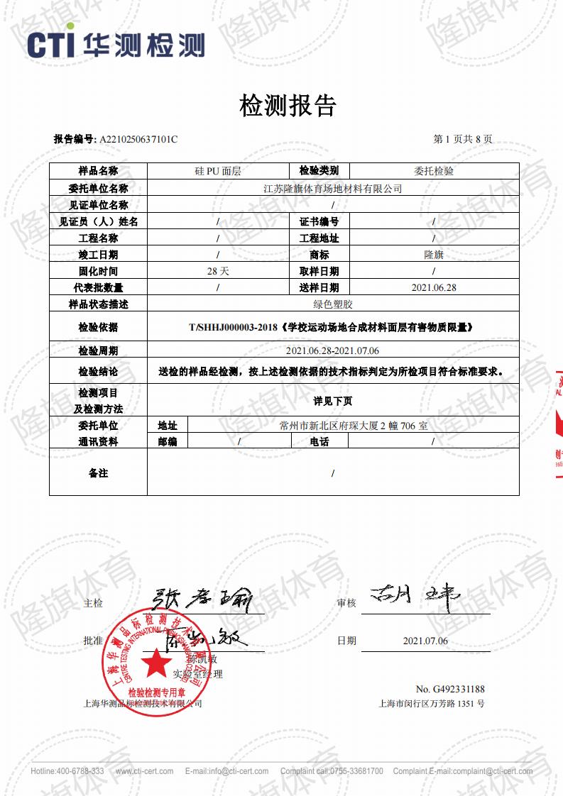 硅PU面层上海团标2.0检测报告,报告名称:T/SHHJ000003-2018《学校运动场地合成材料面层有害物质限量》。 本公司产品全项通过严苛的化学性能全项检测报告,包括TVOC检测、甲醛释放量检测等。