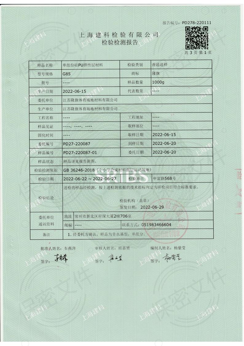 单组份硅PU弹性层新国标GB36246-2018检测报告